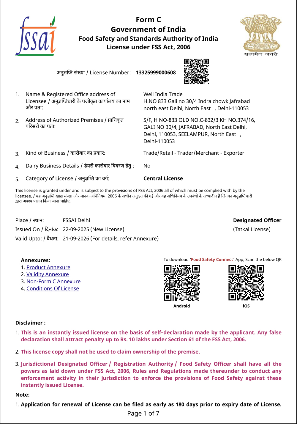 Well India Trade, established in the year 2023, is a registered company under MSME, the AP Chamber of Commerce, and holds a Central License – FSSAI. We operate primarily as a Merchant-cum-Manufacturer Exporter based in Delhi, India.